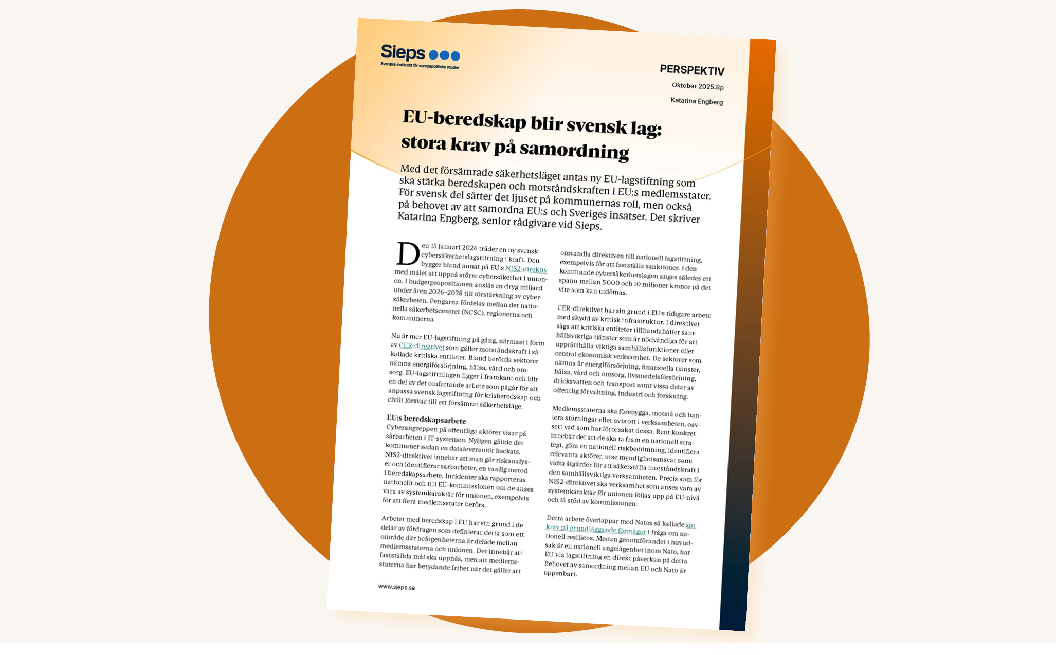Med det försämrade säkerhetsläget antas ny EU-lagstiftning som ska stärka beredskapen och motståndskraften i EU:s medlemsstater. För svensk del sätter det ljuset på kommunernas roll, men också på behovet av att samordna EU:s och Sveriges insatser. Det skriver Katarina Engberg, senior rådgivare vid Sieps, i ett nytt perspektiv.